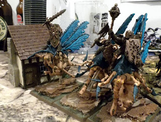 Over on the right the flying Tzeentch gribblies were met by some big fat flies with warriors on the back. And came of worst.